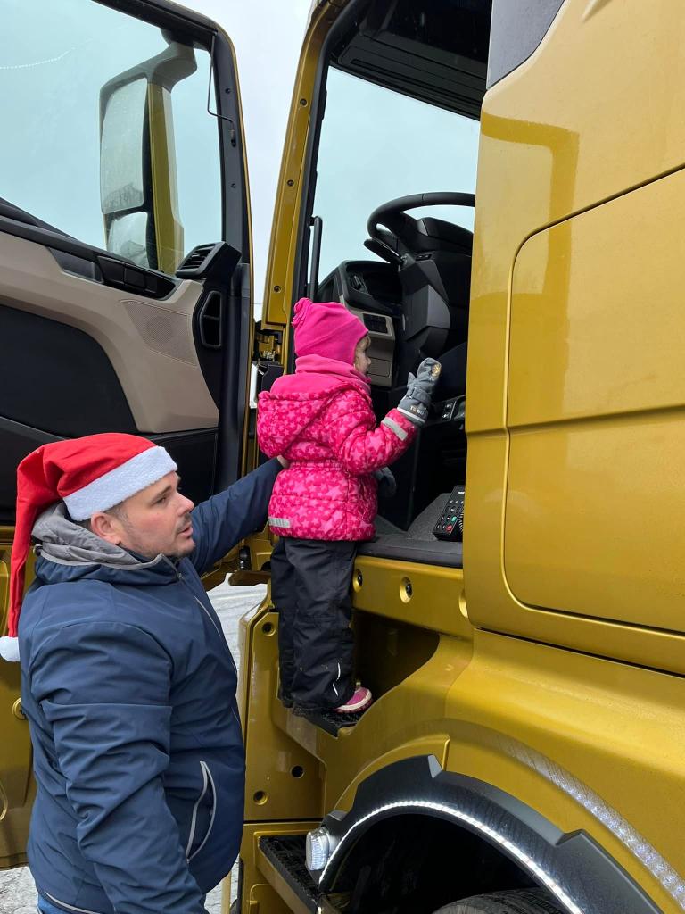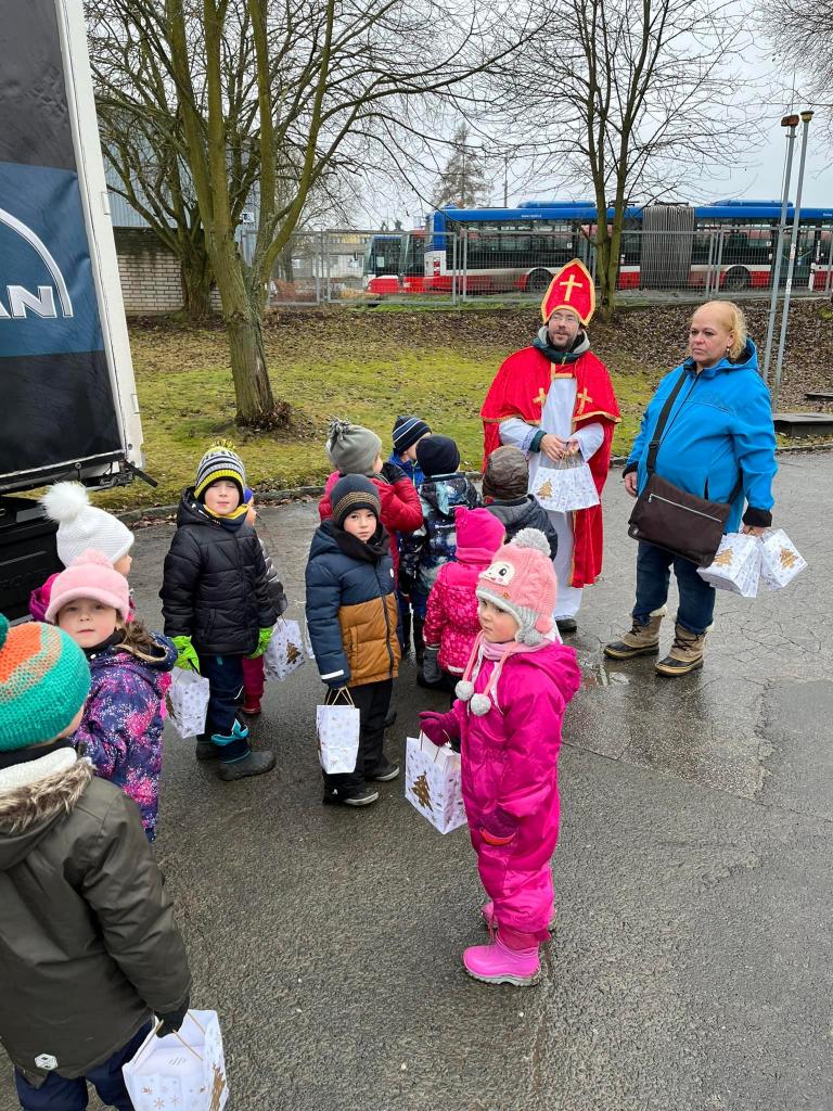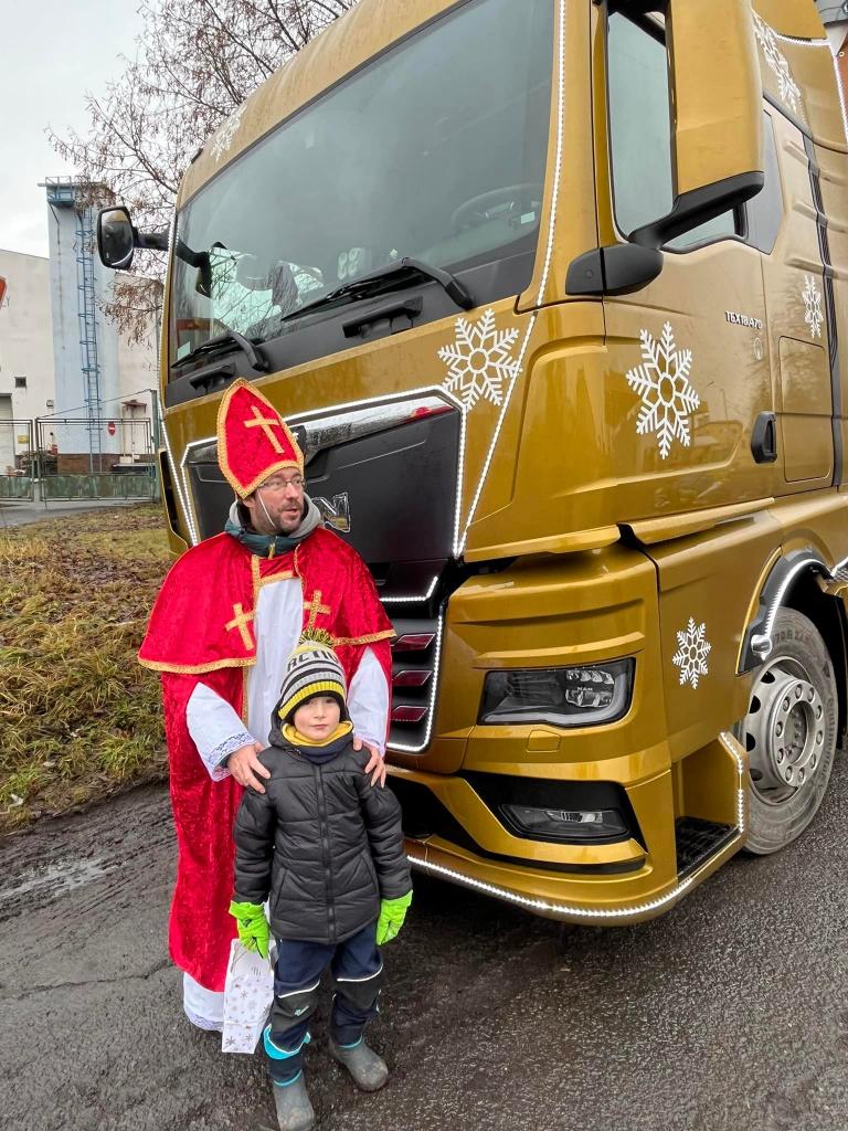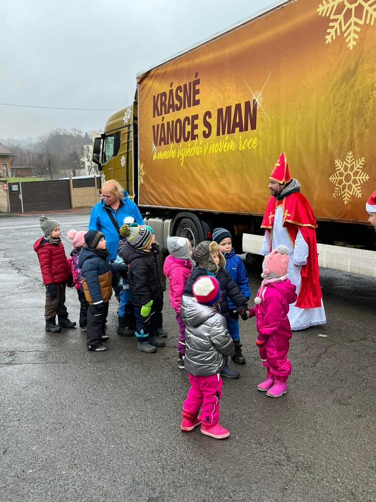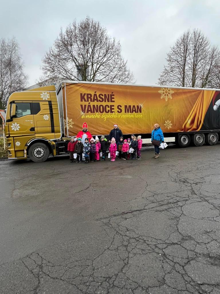 A díky tatínkovi - panu Vaňkovi, nás čekala ještě jedna nadílka! Přijel za námi s vánočním kamionem! Ke školce by se nevešel - ale nám to nevadí! Vyběhli jsme do Jílového k benzínce… všichni si kamion prohlédli a ještě dostali od laskavého Mikuláše dárečky! Moc děkujeme za zajímavý zážitek!!!!